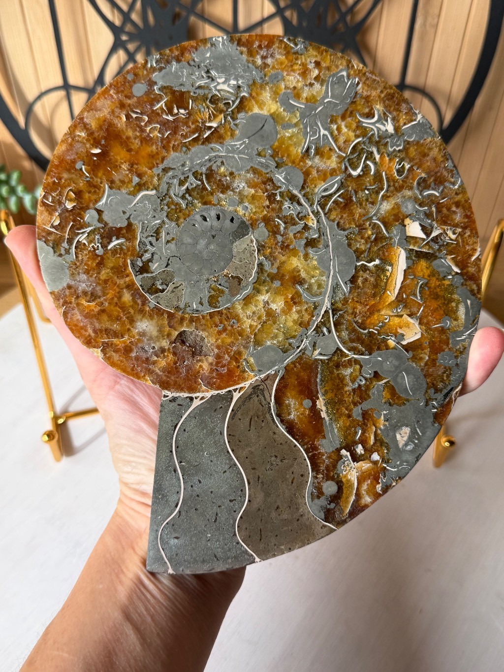 Cette magnifique paire d ammonite est incrustée de pyrite. Des paillettes sont visibles à l’intérieure.bien que cela soit fréquent de trouver de la pyrite dans les ammonites, cette quantité reste rare et confère à cette ammonite une réelle et indiscutable particularité .