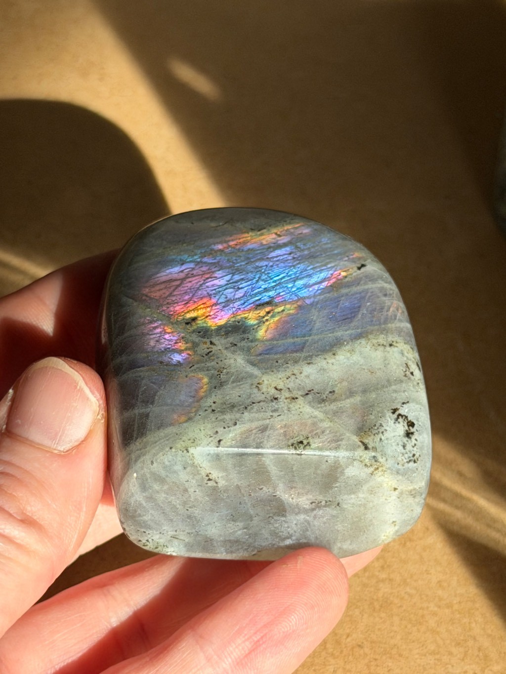 Tous les aspects , faces, cotes , de cette labradorite en forme libre sont visibles en photo sur le site TMINERAUX.