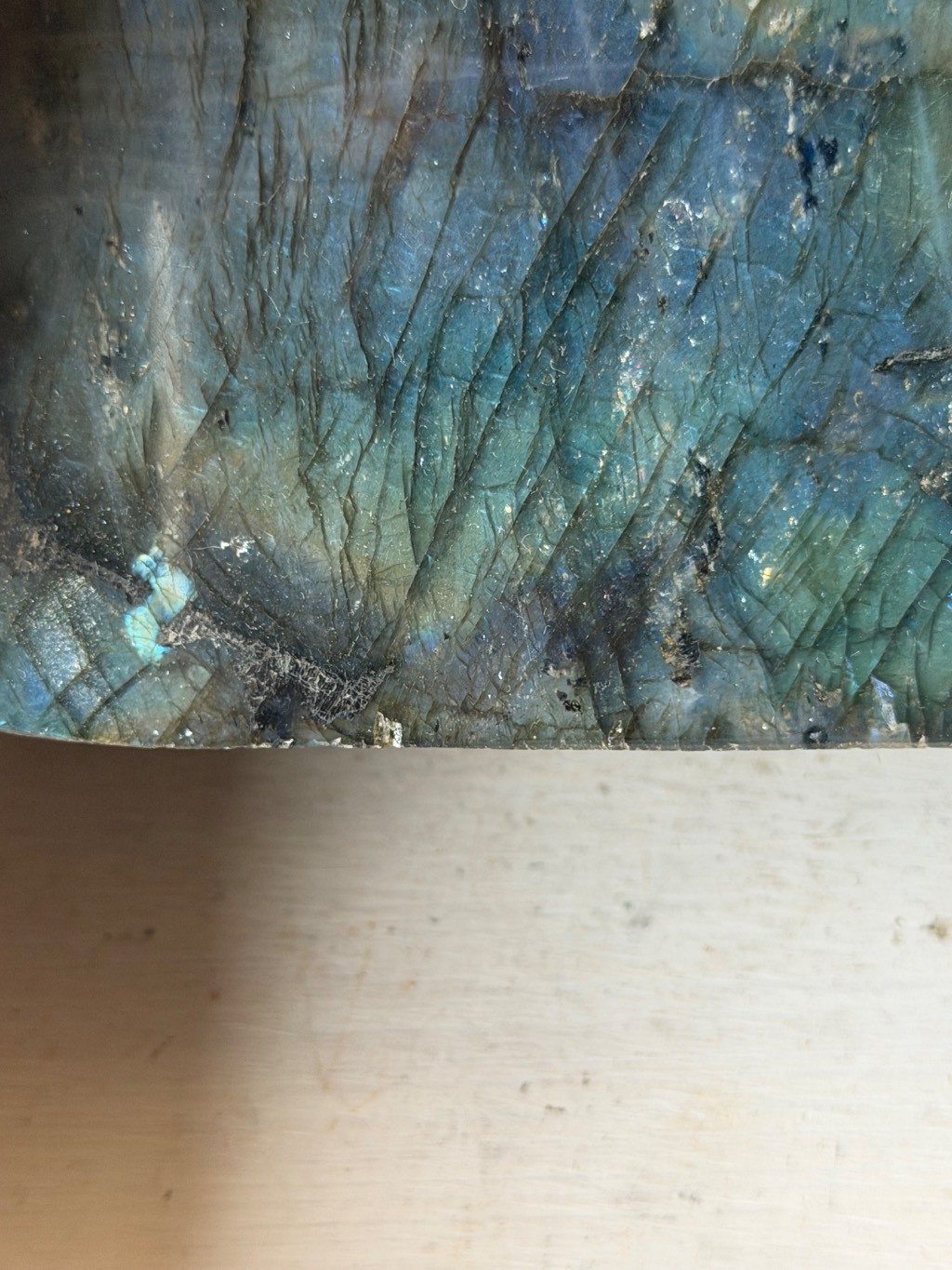 Tous les aspects , faces, cotes , de cette labradorite en forme libre sont visibles en photo sur le site TMINERAUX.