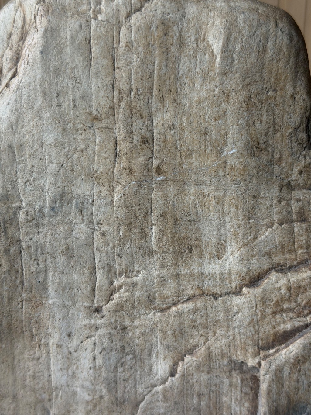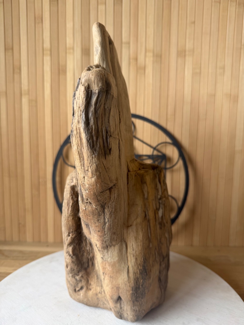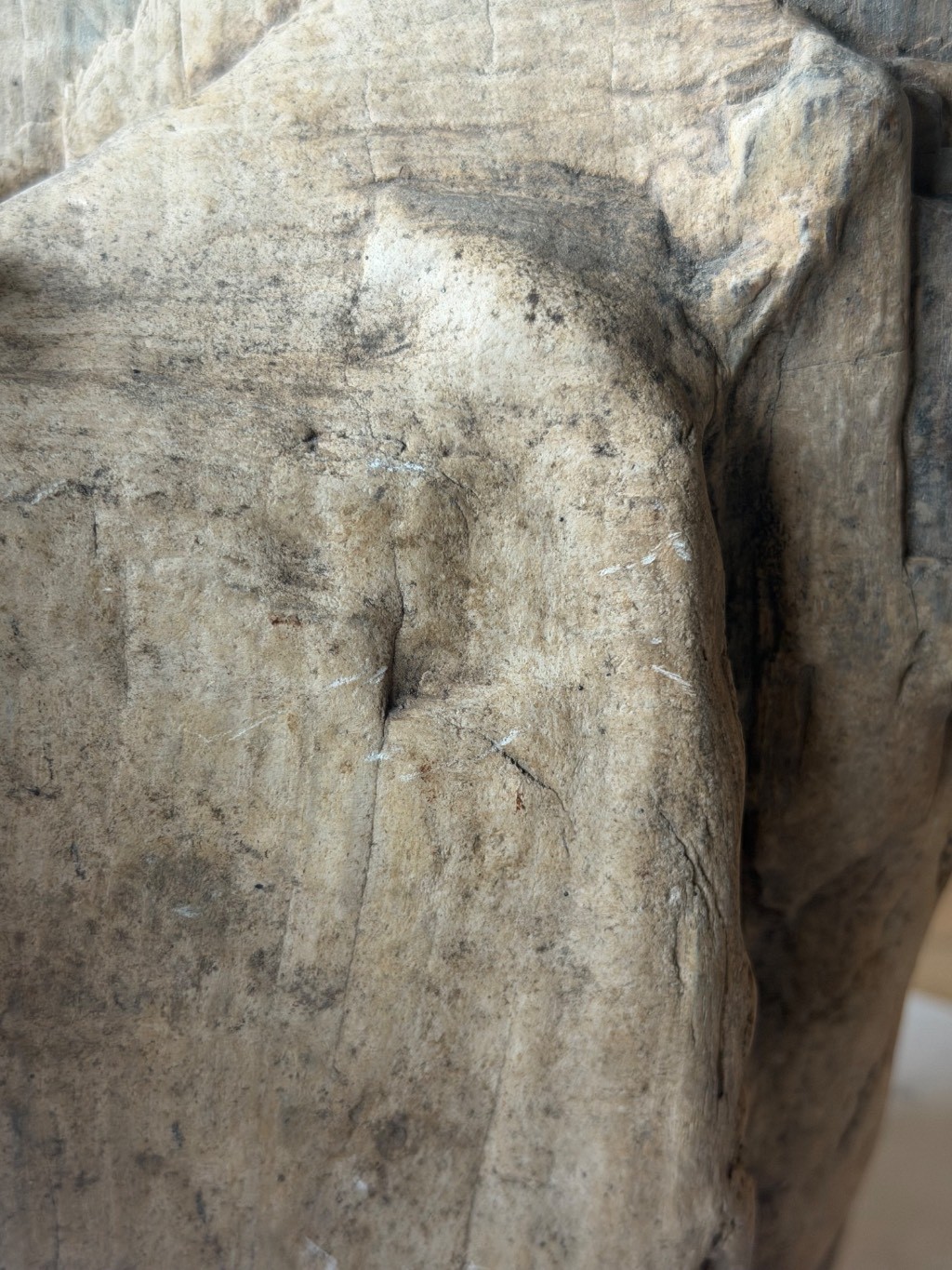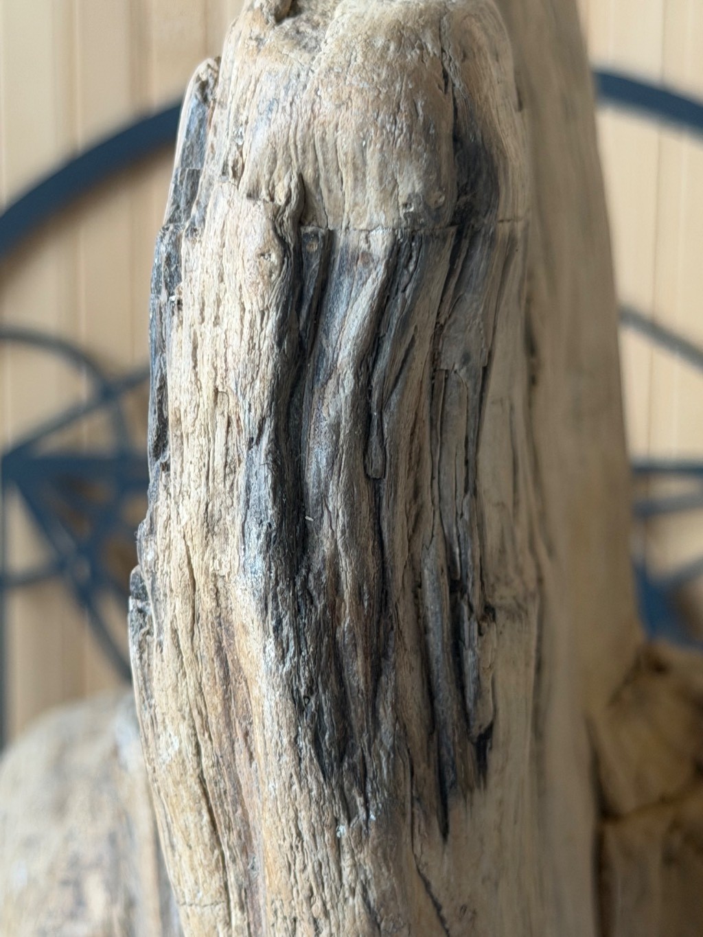 Bloc de bois pétrifié au allures de totem non poli, seulement usé, lissé par le temps. Datation : sans certitude mais très probablement entre 250 et 300 millions d’années (fin du Permien /début du Trias)