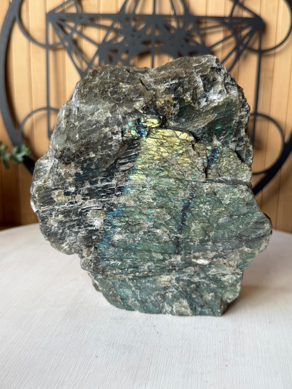 Labradorite se distingue par sa taille imposante et ses reflets chatoyants.