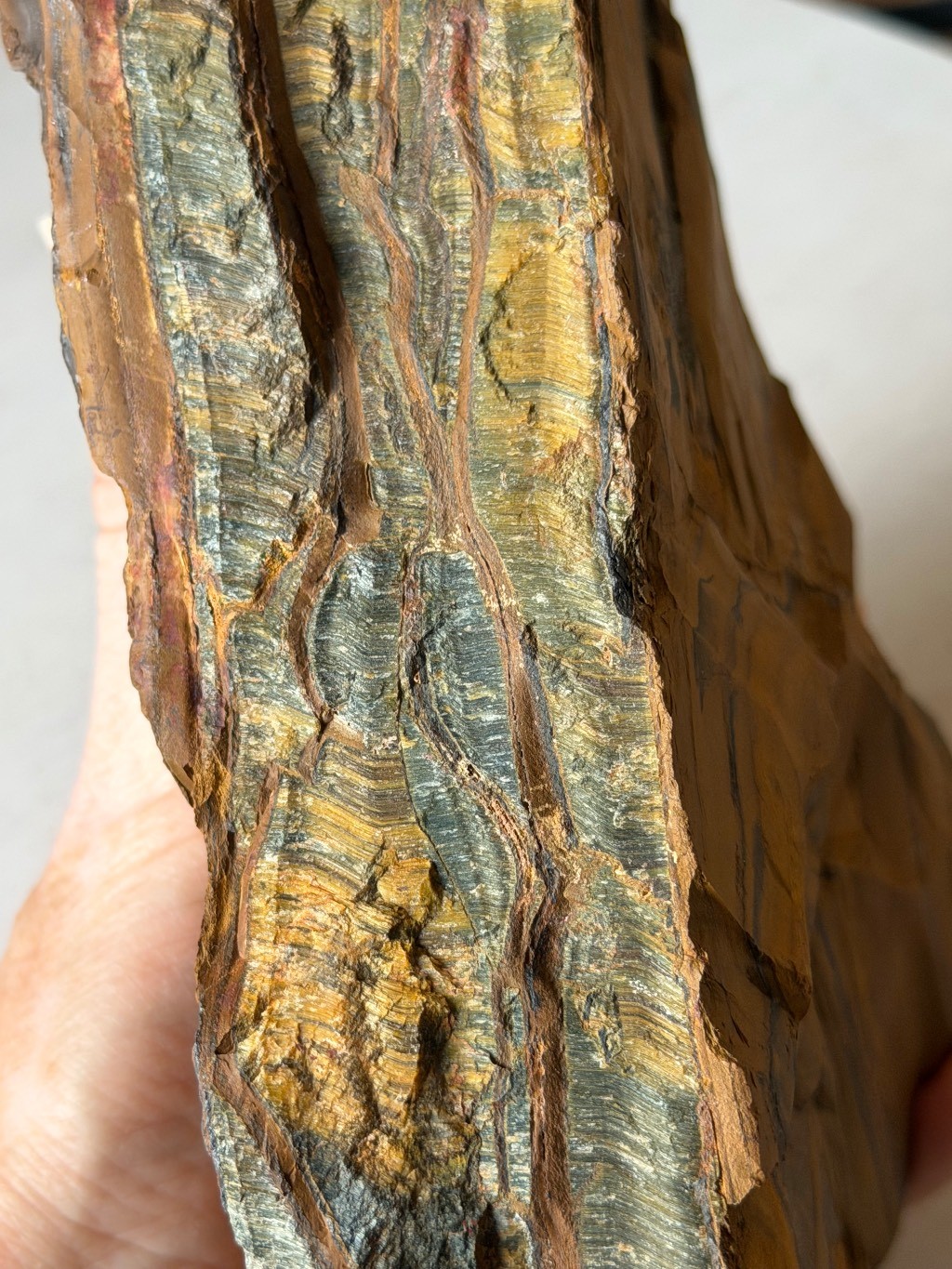Bloc mi œil de tigre mi œil de faucon, tirant principalement sur le second .