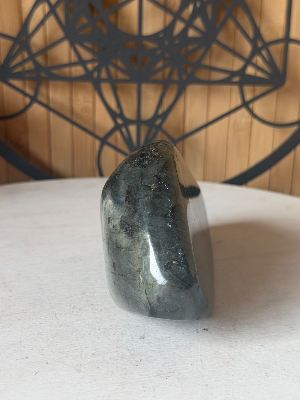 Les reflets de cette labradorite sont facilement visibles. L’orientation tournée sur la photo de présentation est fonction de la source de lumière . À contrario, sur la dernière photo la forme est visible de face du fait d une autre orientation .