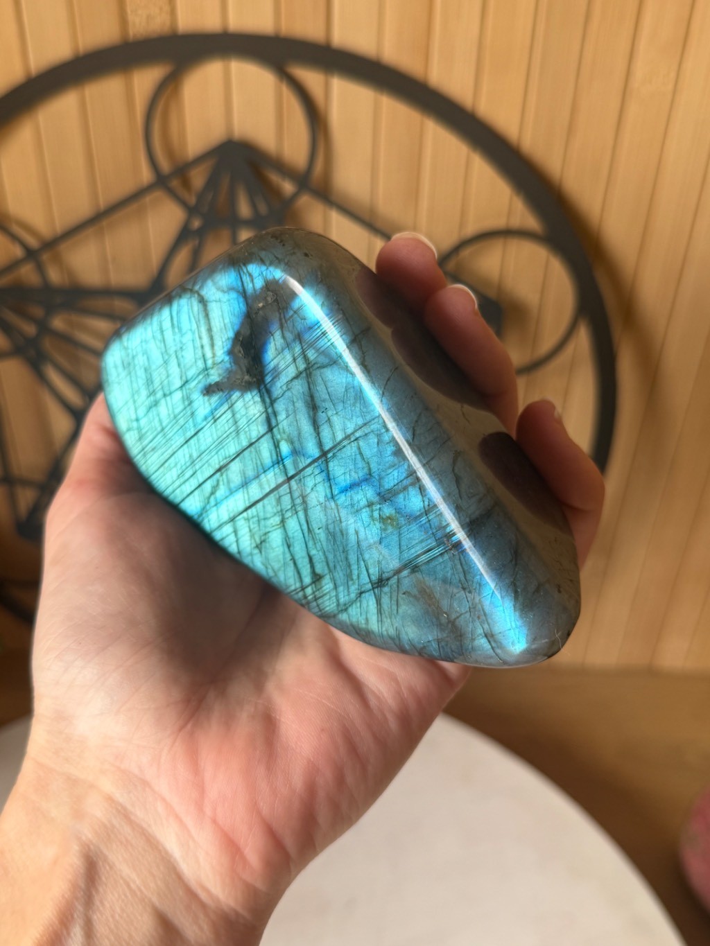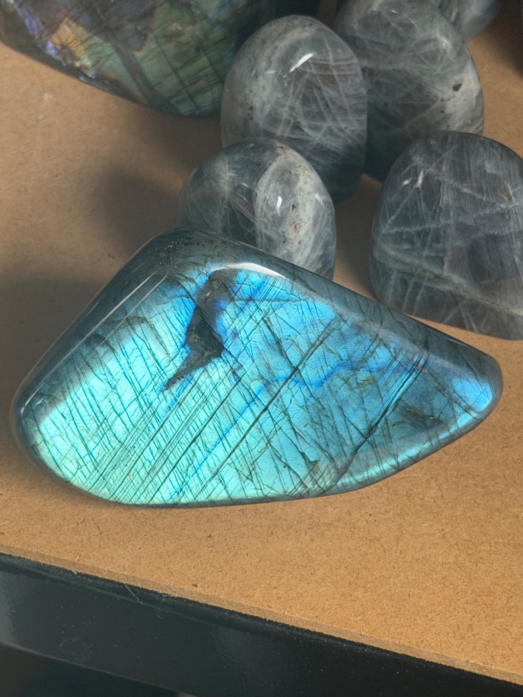 La Labradorite est un minéral du groupe des feldspaths plagioclases. Elle est connue pour son effet optique coloré appelé Labradorescence, qui produit des reflets bleus, verts, dorés ou parfois violets.