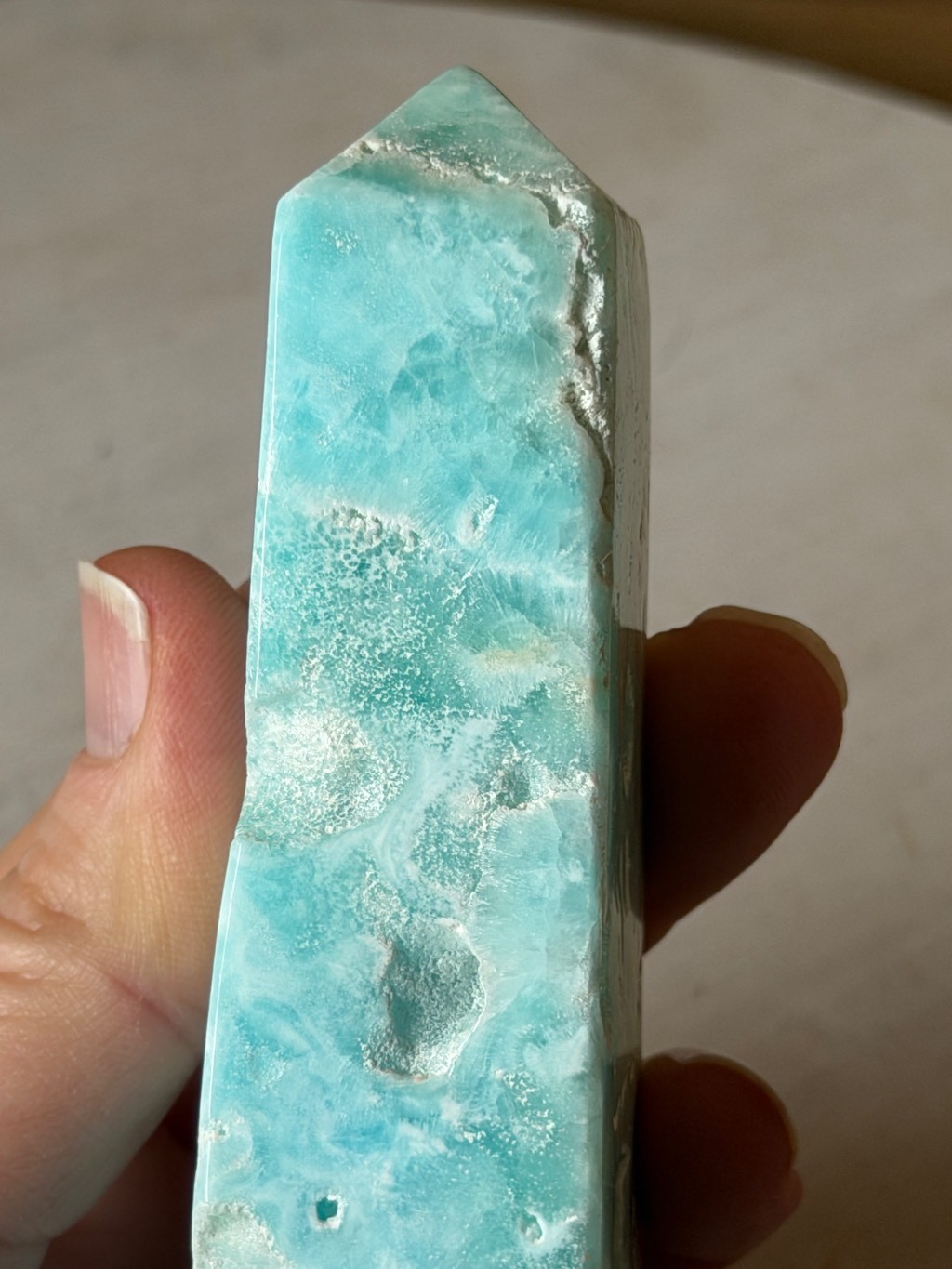 Pointe polie en aragonite bleue du Pakistan,