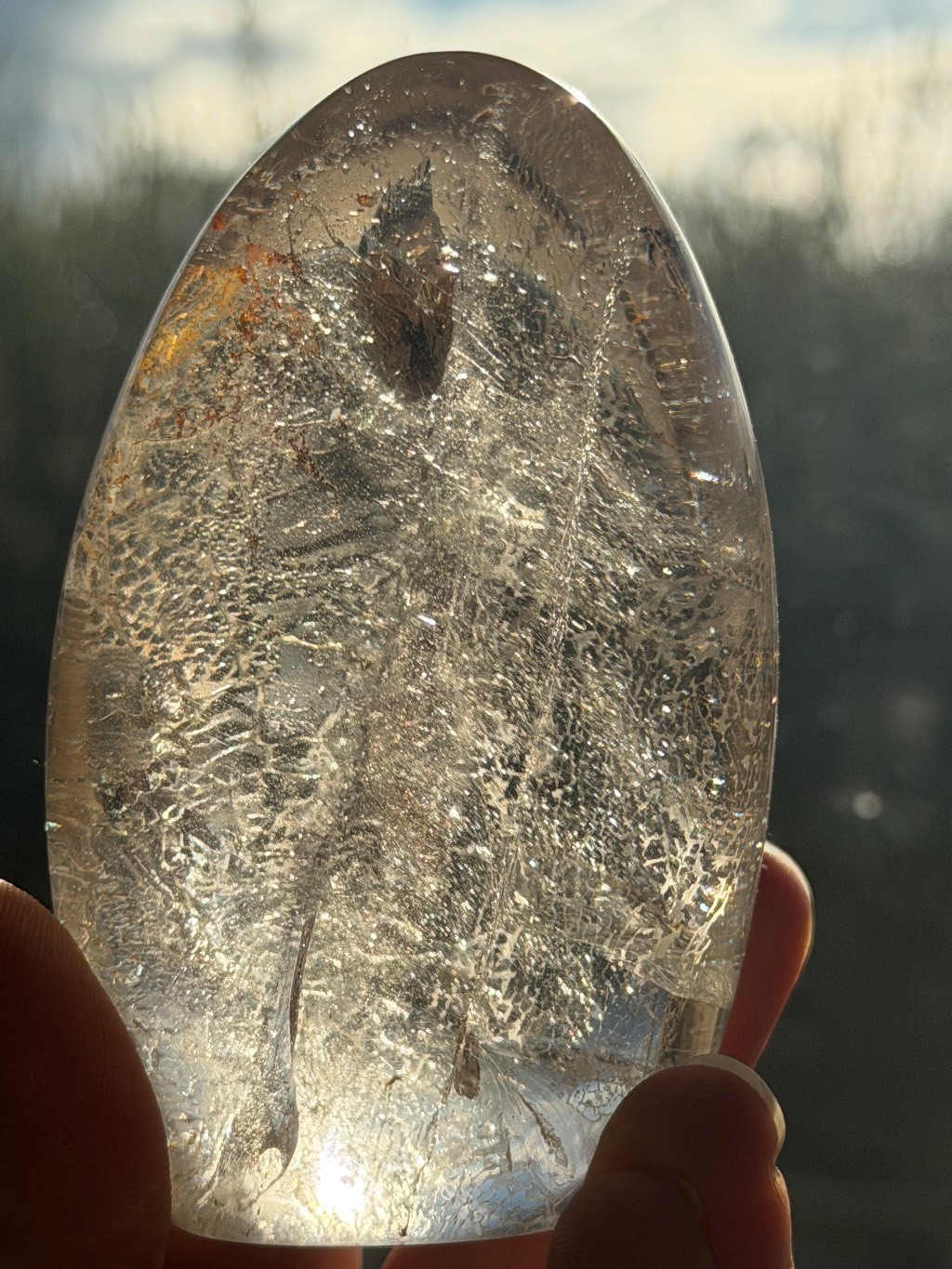 Quartz ou cristal de roche à inclusions poli en forme libre de Madagascar,